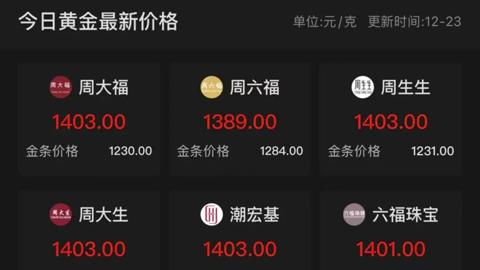 受近期国际金价影响,以人民币计价的黄金价格再创新高。12月23日,多个品牌足金饰品报价首次冲上每克1400元。周生生足金饰品标价1403元/克,较前一日1367元/克的价格上涨36元/克;周大福、周大生足金饰品标价1403元/克,较前一日1368元/克的价格上涨35元/克;老凤祥足金饰品标价1399元/克,较前一日1365元/克的价格上涨34元/克;老庙黄金足金饰品标价1402元/克,较前一日1367元/克的价格上涨35元/克。
