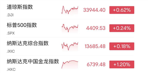 当地时间10日,美股三大股指小幅收涨,其中,道指涨0.62%,标普500指数涨0.24%,纳指涨0.18%。