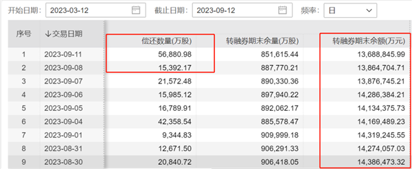 看完楼市,我们再来看股市。据Wind数据,9月11日,转融券偿还数量达到近三个月最高水平,还券达5.688亿股(上一次还券高潮发生在6月5日,当天还券超过6.1亿股),较前一交易日上升了将近270%。与此同时,转融券余额下降了将近20亿元,这个数据自8月30日之后持续下行近70亿元,当时转融券余额达到了1438亿元以上规模。