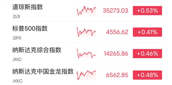 当地时间22日,美股三大股指小幅收涨,截至收盘,道指涨0.53%,报35273.03点;标普500指数涨0.41%,报4556.62点;纳指涨0.46%,报14265.86点。