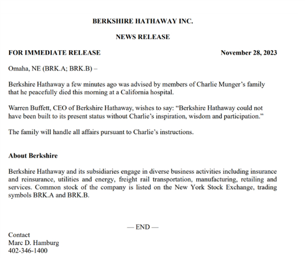 今天对于所有投资者来说无疑是悲伤的一天。投资界的传奇,查理·芒格逝世。当地时间周二(11月28日),伯克希尔-哈撒韦在其子公司美国商业资讯网站上发布声明表示,董事会副主席查理·芒格(Charlie Munger)的家人几分钟前告知公司,芒格于当天早上在加州的一家医院中安详去世。
