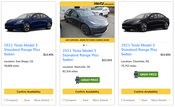 由于Hertz公司之前大批量采购特斯拉各车型,目前该公司出售的电动汽车也几乎清一色均为特斯拉。根据Hertz北美官网的报价,该批次于2021年和2022年购入的特斯拉平均保值率仅为50%。