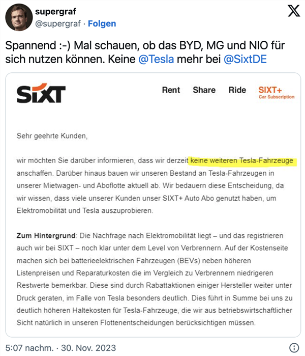 根据Sixt当前的商业模式,该公司与大部分欧洲车企签订的购买合同中都附有车企以固定价格回购条款,而不提供回购选项的特斯拉则需要租车公司自行承担车辆剩余价值风险。Sixt于去年11月的公告中,将特斯拉新车价格的大幅度折扣以及新车定价策略的不可预测性,列为特斯拉车型保值率难以确定的主要原因。