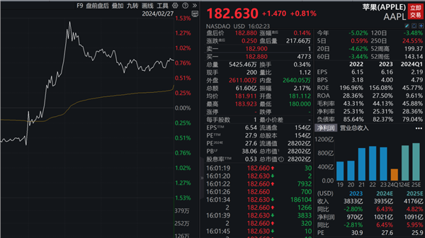 苹果对上述消息拒绝置评。传出消息后,本周二美股午盘时段,盘中曾跌近0.9%的苹果股价持续反弹,午盘转涨后涨超1%,截至收盘,苹果报182.63美元,涨幅0.81%,市值2.8万亿美元。
