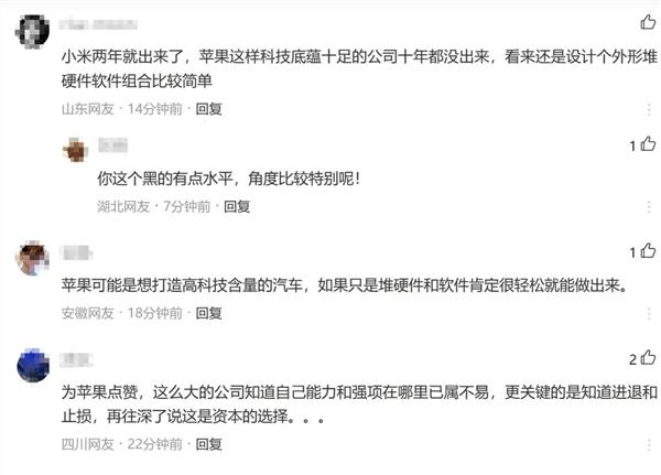 也有人说,“点赞,知道进退止损”“苹果的利润模式,注定了它不会和其他厂商打价格战,苹果造电动车没有先发优势,电动车的技术储备又不丰富,眼看着比亚迪掀起了价格大战的狂潮,苹果造汽车,第一步迈出去就是惊涛骇浪,利润还少得可怜”。