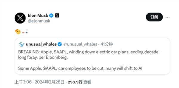 媒体报道称苹果将放弃长达10年的电动汽车开发计划,加码生成式人工智能。