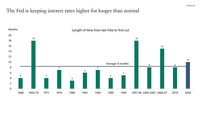 从过去近60年的情况看,美联储最后一次加息至首次降息,平均间隔时间为8个月。而如今距离7月最后一次加息,已过去近10个月。这意味着什么呢?一种可能性显示是美联储还未完成加息(这其实已成为近来华尔街的一个焦虑点);而如果本轮加息周期确实已结束,那么降息的“姗姗来迟”可能也同样意味着麻烦。如图中所示,此前60多年只出现过三次加息/降息间隔月份达到10个月以上,而最终的结果要么是大滞胀(1970年),要么是金融危机(1998年和2007年)。