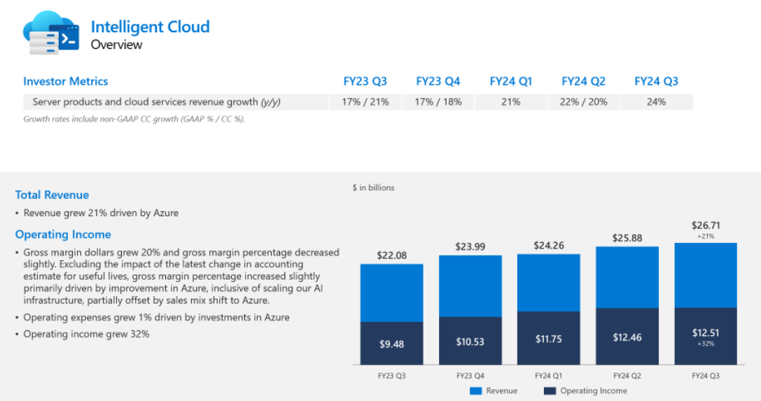 分业务来看,首先是微软目前最受重视的智能云业务,在本财季营收267.08亿美元,高于市场预期的262.5亿美元,较上年同期的220.81亿美元增长21%,增速高于前四个财季。其中,Azure和其他云业务营收同比增长31%,微软称有7%的增长受到对AI需求的驱动,该比例在前一个财季为6%。