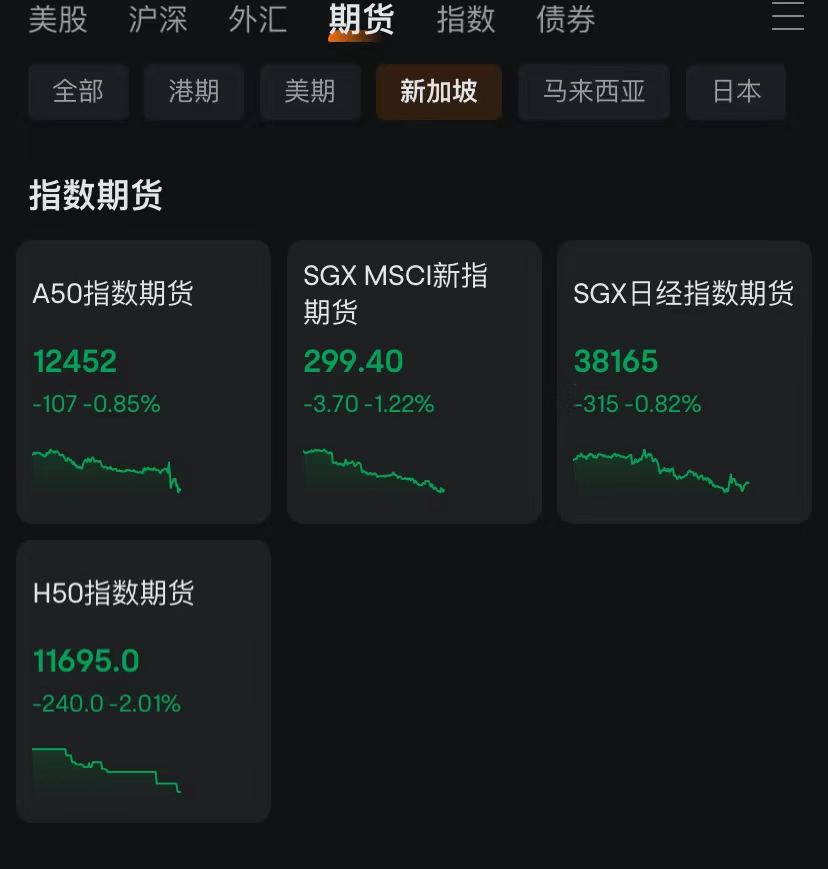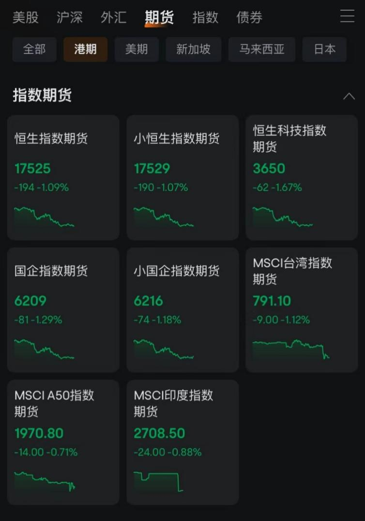 恒生科技指数期货一度跌破1.7%,日经225指数期货跌幅近1%。