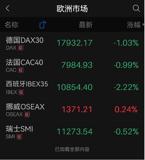 欧洲三大股指收盘也全线下跌。法国巴黎股市CAC40指数报收于7984.93点,比前一交易日下跌80.22点,跌幅为0.99%;德国法兰克福股市DAX指数报收于17932.17点,比前一交易日下跌186.15点,跌幅为1.03%。