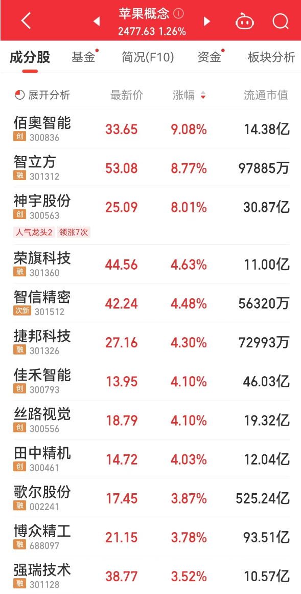 佰奥智能、神宇股份、智信精密等苹果概念股也有不同程度涨幅。
