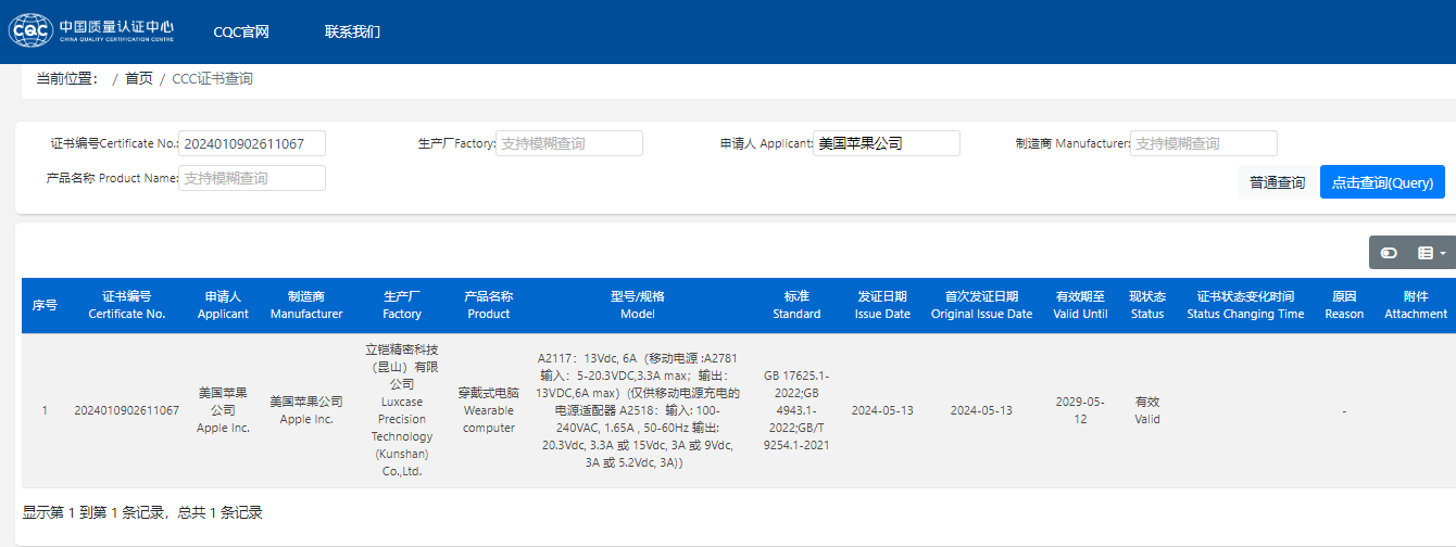 中国质量认证中心网站的信息显示,苹果公司的头显产品以“穿戴式电脑”的名称完成了3C认证流程,认证发证日期为2024年5月13日,有效期至2029年5月12日。