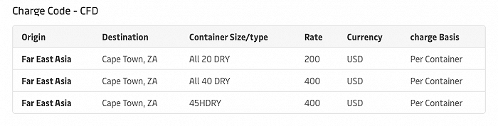 马士基5月16日公告称,将对远东至南非开普敦航线收取目的地拥堵费(CFD),5月15日生效,对越南至南非开普敦航线收取目的地拥堵费,6月1日生效,对中国台湾至开普敦航线收取目的地拥堵费,6月15日生效。