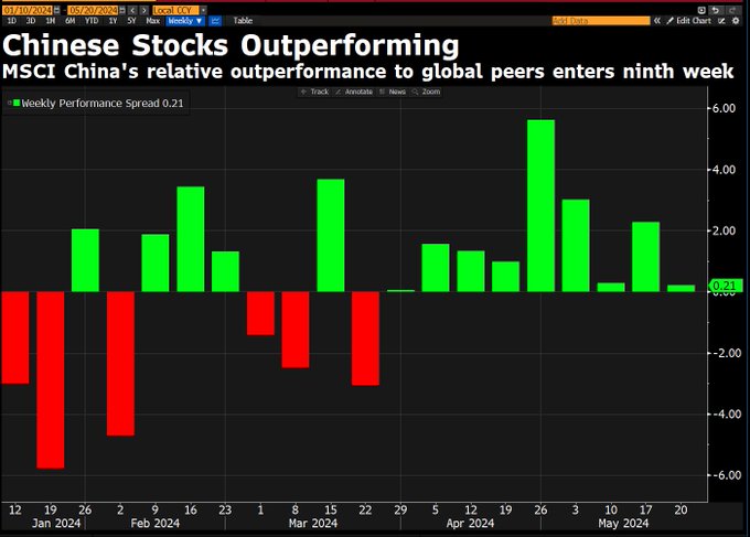 根据业内统计,截止上周五,MSCI中国指数已经连续八周跑赢了MSCI全球指数,本周将有望向连续第九周跑赢发起冲击。MSCI全球指数自2月以来不断刷新了历史高位纪录,不过单就近期的走势而言,中国市场的表现还要更为抢眼一些。周一,沪指收盘上涨0.54%,再创年内新高。