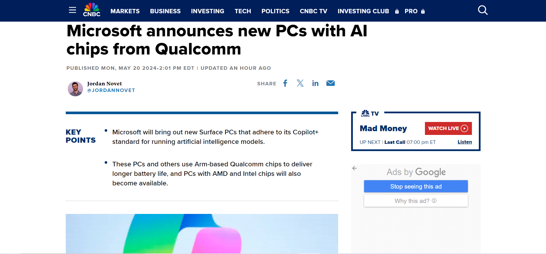美东时间5月20日周一,该公司宣布推出一款Surface笔记本电脑和一款Surface Pro平板电脑,均搭载高通芯片,可在无互联网连接的情况下运行某些人工智能任务。联想、戴尔、惠普、华硕、宏碁和三星等其他电脑制造商也在推出搭载高通Snapdragon X Elite和X Plus处理器的AI就绪电脑,这些处理器承诺更长的电池寿命,并将运行微软的Copilot AI聊天机器人。