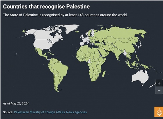半岛电视台统计的迄今承认巴勒斯坦的国家。图中绿色部分为承认的国家,白色部分为不承认国家。