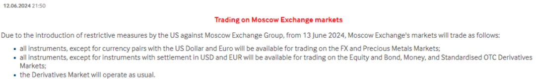公告显示,在股票市场、货币市场和标准化衍生金融工具市场中也将不再交易以美元和欧元进行结算的金融工具。