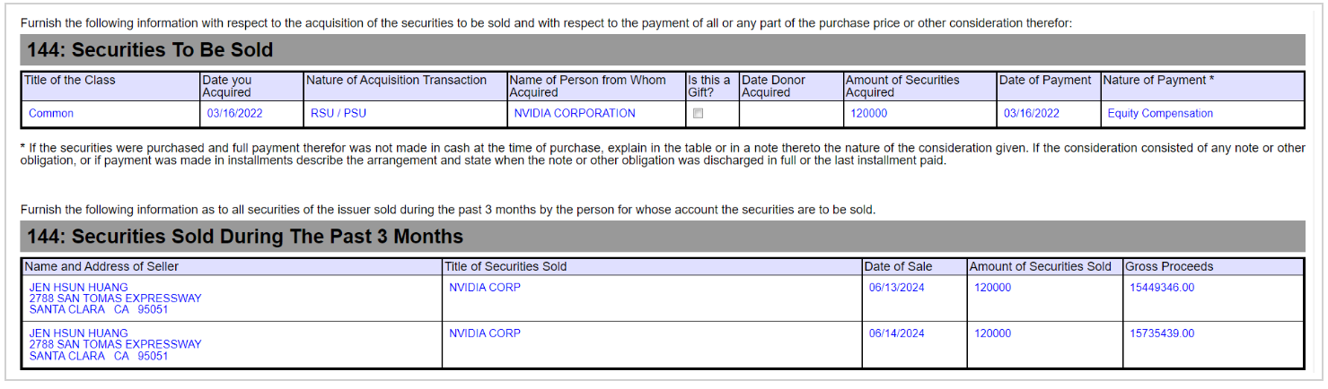 而在当地时间6月17日,黄仁勋又提交了一份被称作“拟议出售证券通知书”的144表格,计划在当日继续出售于2022年3月获得的12万股。