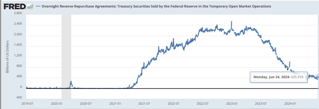 当地时间6月24日,美联储在固定利率逆回购操作中总计接纳了71个对手方的4359.16亿美元。这个数据比6月17日多了1000亿,也就意味着,这段时间,美联储在回收市场的流动性。