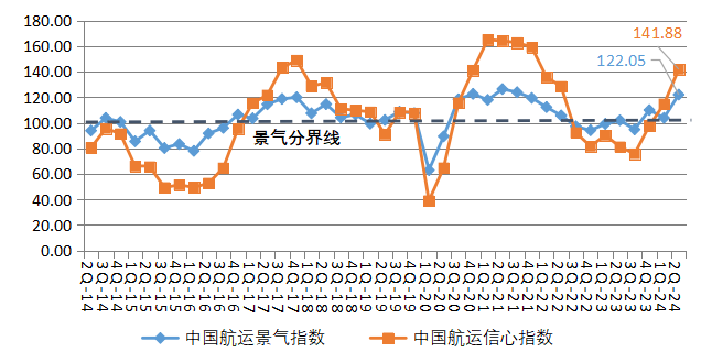 《报告》显示,二季度中国航运景气指数为122.05点,较上季度大幅上升18.17点,跃入较为景气区间;二季度中国航运信心指数为141.88点,较上季度大幅上升27.11点,由相对景气区间升至较为景气区间,所有企业信心指数均有所上升且位于景气分界线以上。