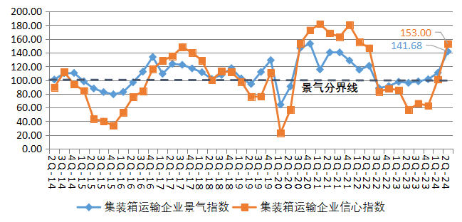 上海国际航运研究中心表示,今年以来,集装箱航运市场价格显著走强。根据《报告》,二季度集装箱运输企业的景气指数为141.68点,较上季度大幅上升30.91点,进入较为景气区间;集装箱运输企业的信心指数为153.0点,较上季度大幅上升51.93点,迈入较强景气区间。