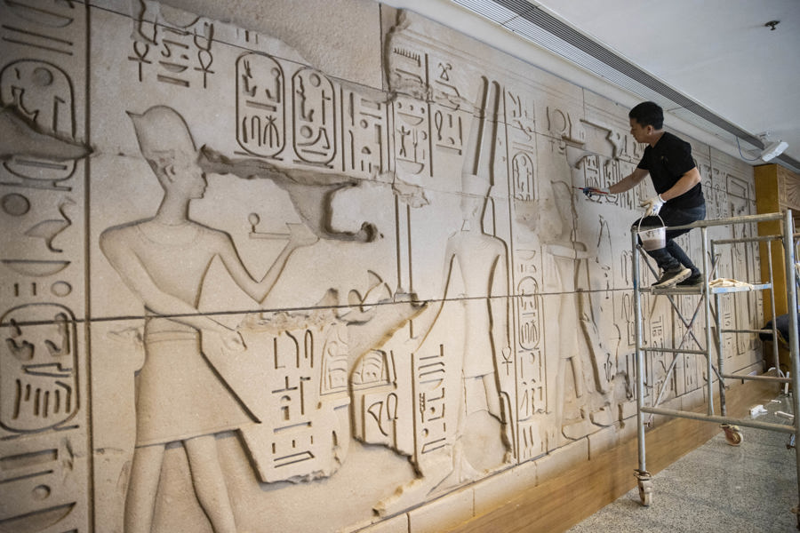 “图坦卡蒙的时代”展厅外工人正在加紧施工。