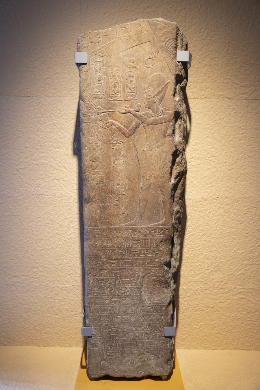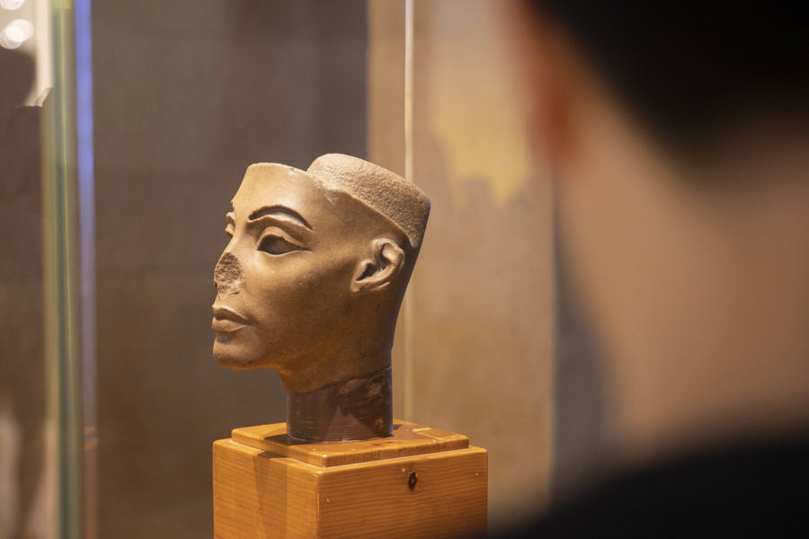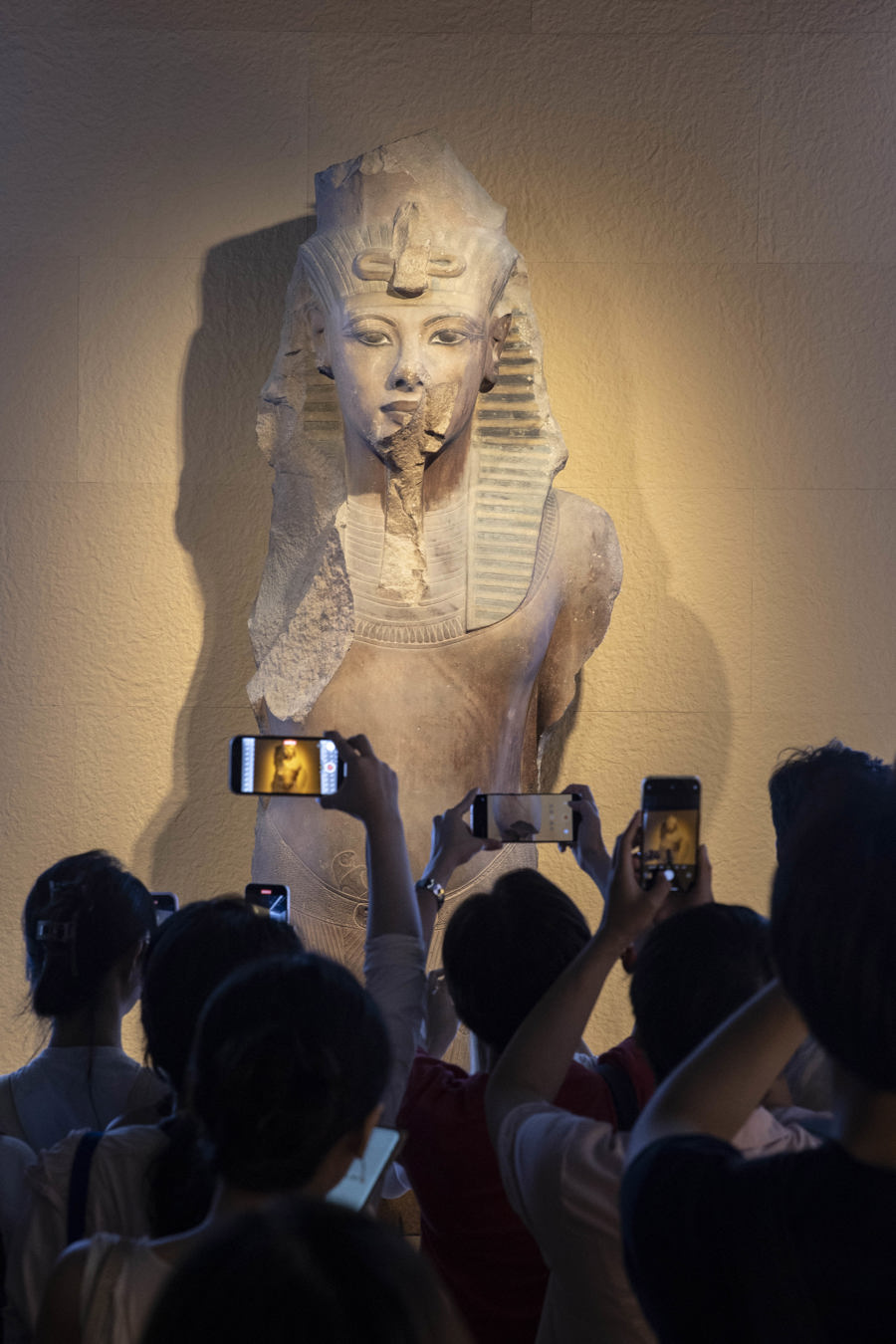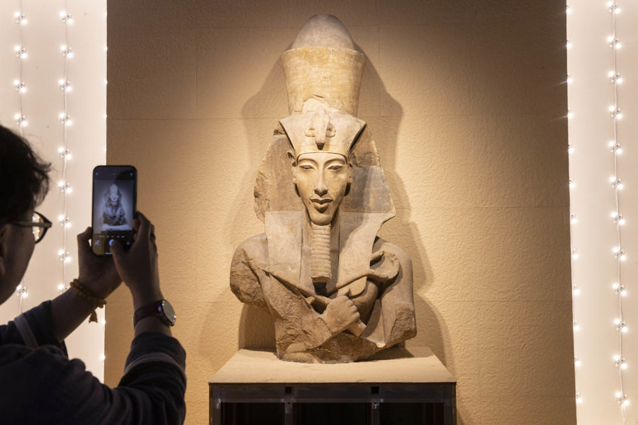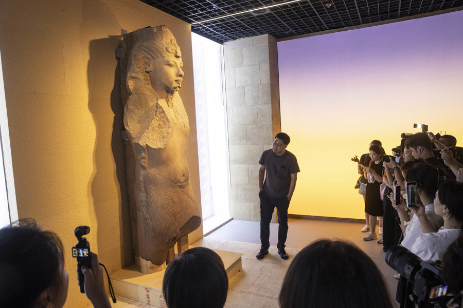 图坦卡蒙雕像原本放在埃及国家博物馆中不起眼的地方。“这是被埃及学界严重低估的一件器物,是图坦卡蒙时代的独特样式。”在雕像前,展览策展人、上海外国语大学世界艺术史研究所研究员薛江介绍道。“图坦卡蒙是埃及历史上一位非常特殊的法老,他是一个少年法老,在幼儿时期继位,但是在青年时期过世,所以很多人都会觉得图坦卡蒙是一个无所作为的法老,但是这位少年法老其实做了很大的贡献,一则他打破了父亲创立的一神崇拜,回归到传统信仰当中,其次是他把古埃及的秩序重新建构起来。”