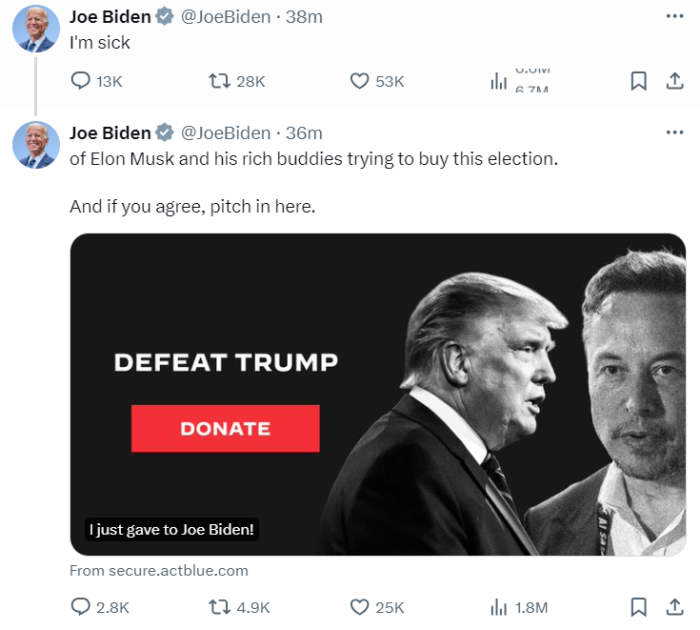 美国总统拜登当地时间7月17日在社交媒体平台X发文称,“马斯克及其富人团体试图收买这次选举,我对此感到恶心”。