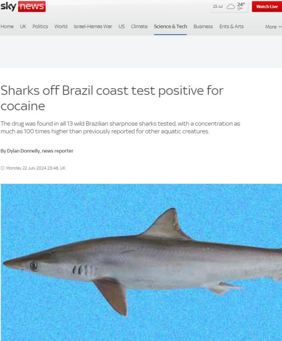 报道称,长期以来,研究人员一直认为,走私者向水中倾倒的毒品可能会影响海洋生物。科学家们检测了生活在沿海水域的13条鲨鱼发现,鲨鱼确实受到了污染海洋的药物的影响。