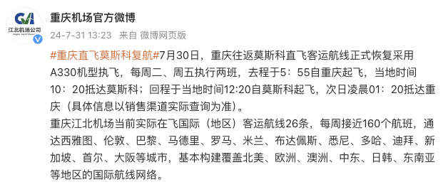 据重庆机场消息,7月30日,重庆往返莫斯科直飞客运航线正式恢复采用A330机型执飞,每周二、周五执行两班。重庆江北机场当前实际在飞国际(地区)客运航线26条,每周接近160个航班,通达西雅图、伦敦、巴黎、马德里、罗马、米兰、布达佩斯、悉尼、多哈、迪拜、新加坡、首尔、大阪等城市,基本构建覆盖北美、欧洲、澳洲、中东、日韩、东南亚等地区的国际航线网络。