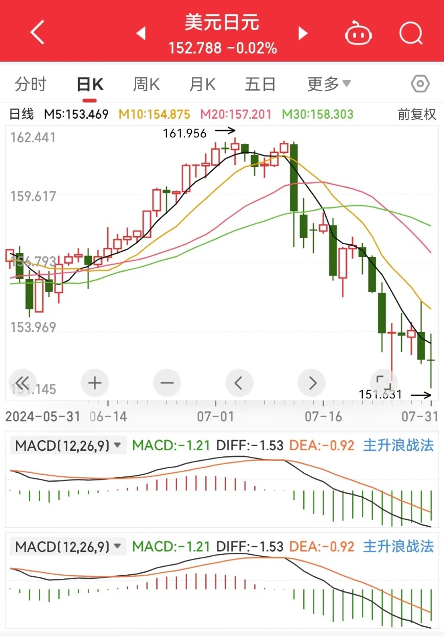 因日本央行加息15个基点,美元/日元短线下挫110点,最低跌至151.58,该位置正好是200日均线强支撑所在;随后汇价快速反弹,最高触及153.88。
