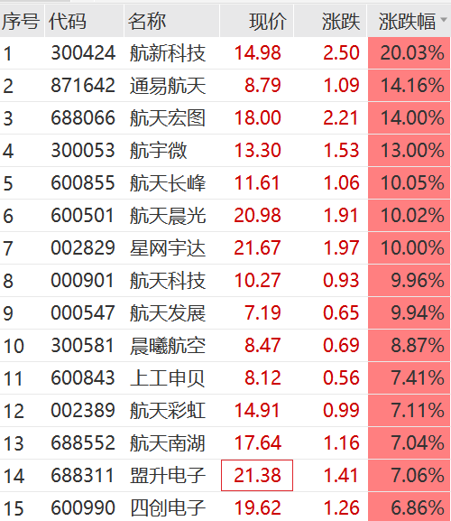8月1日上午,国防军工板块领涨市场,商业航天概念持续火热。航新科技20CM涨停,航天晨光5连板,航天长峰、星网宇达、航天发展、航天科技等多股涨停,航天宏图、上工申贝等多股跟涨。