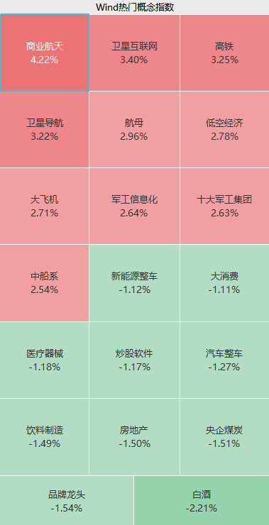 盘面上,上午航天军工板块涨幅居前,商业航天、卫星互联网、高铁、航母等概念火热;公路、建筑、通信设备等板块走高;白酒股集体走低,房地产、餐饮旅游、教育板块等不振。