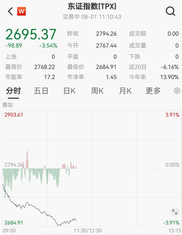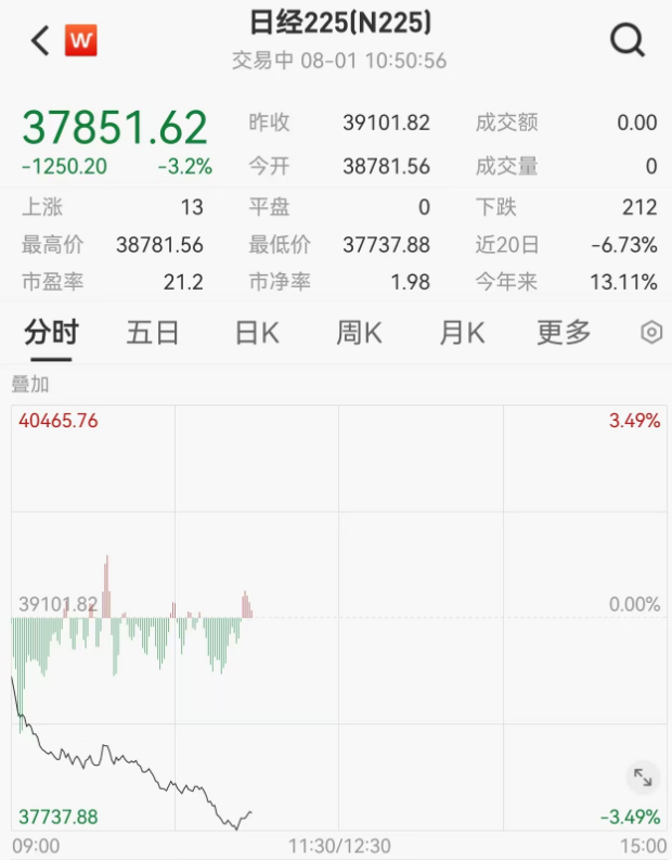 首先来关注一下日本股市情况:8月1日上午,日本股市持续走弱,日经225盘中跌幅为3.2%,东证指数盘中跌超3.5%。