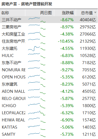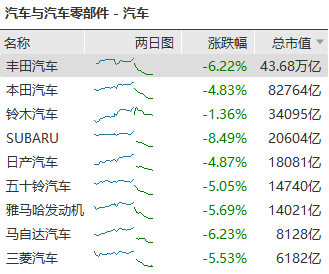 日本地产股大幅下跌,住友房地产开发跌超10%,东急不动产、三菱房地产、三井不动产跌超8%。汽车股同步走低,丰田汽车跌超6%,本田汽车、日产汽车等跟跌。