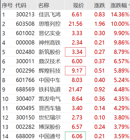 另外,上午高铁指数持续拉升,思维列控、晋亿实业、神州高铁涨停,鼎汉技术、新筑股份等跟涨,中国中车涨超5%。