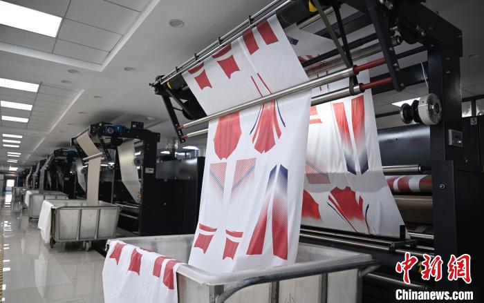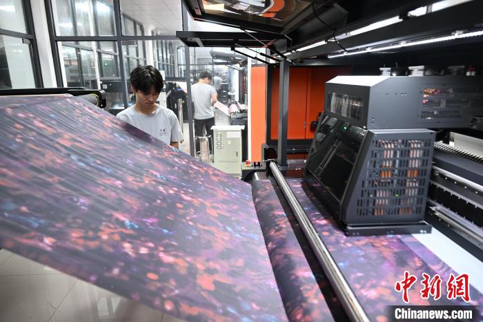 8月8日,绍兴乾雍纺织有限公司内,自动化设备正在打印加拿大体育代表团服饰面料印花,应对补单需求。该企业自2018年开始做功能性面料,通过借力人才和科技,其设备在打印中国体育代表团和加拿大体育代表团服饰印花时,智能算法控制的每平方米喷墨量精准度达到万分之一毫升级别。近日,巴黎奥运会正在举办中,而中国体育代表团和加拿大体育代表团的部分服饰,即来自于“国际纺都”浙江绍兴柯桥的多家企业。8日,记者走进柯桥,探访这些企业的转型发展之路,以及奥运相关服饰产品的生产线。中新社记者王刚摄