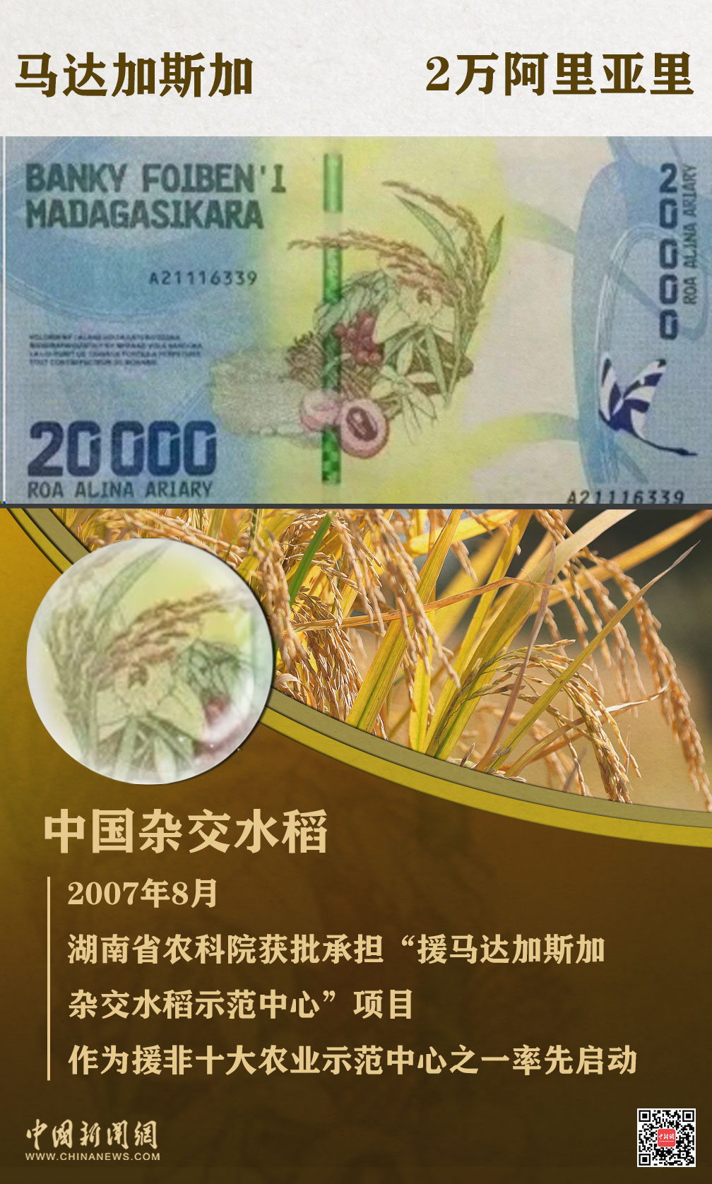马达加斯加经济以农业为主,水稻是主要农作物。以前,由于缺乏优质的水稻种子和成熟的水稻种植技术,稻米产量始终无法完全满足本国民众口粮需求。2007年,中国援马达加斯加杂交水稻示范中心正式启动,20多位中国农业专家先后深入马达加斯加田间地头,开展科研、示范、推广等工作,帮助当地民众圆粮食自给自足之梦。