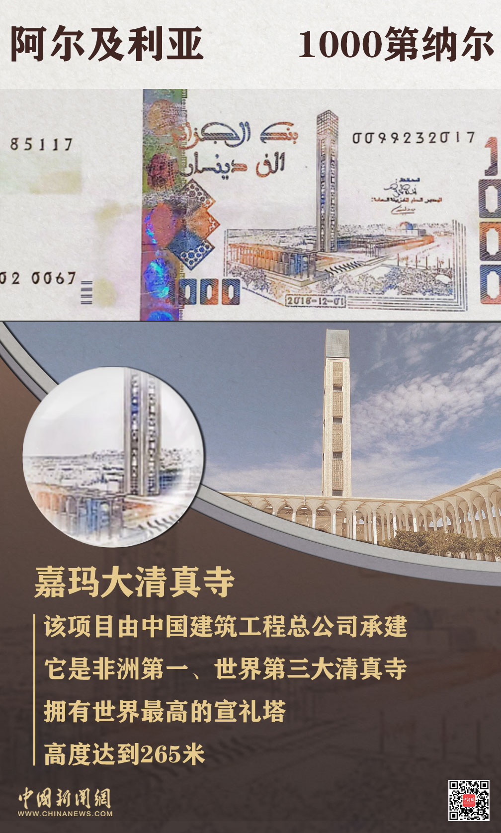 位于阿尔及利亚首都阿尔及尔中轴线上的嘉马大清真寺是非洲第一大、世界第三大清真寺,在面额1000第纳尔纸币上熠熠生辉。它由中国建筑工程总公司承建,拥有世界最高的宣礼塔,高度达到265米。凭借优越的建筑艺术,该清真寺也被称为“千年工程”。