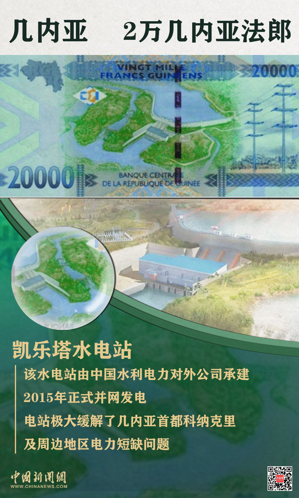 面值2万几内亚法郎纸币的背面印着凯乐塔水电站的图案。该水电站由中国水利电力对外公司承建,2015年正式并网发电。半个多世纪以来,中几两国同心携手发展几内亚的水电事业,帮助几内亚逐步实现从西非“水塔”变西非“电塔”的梦想。