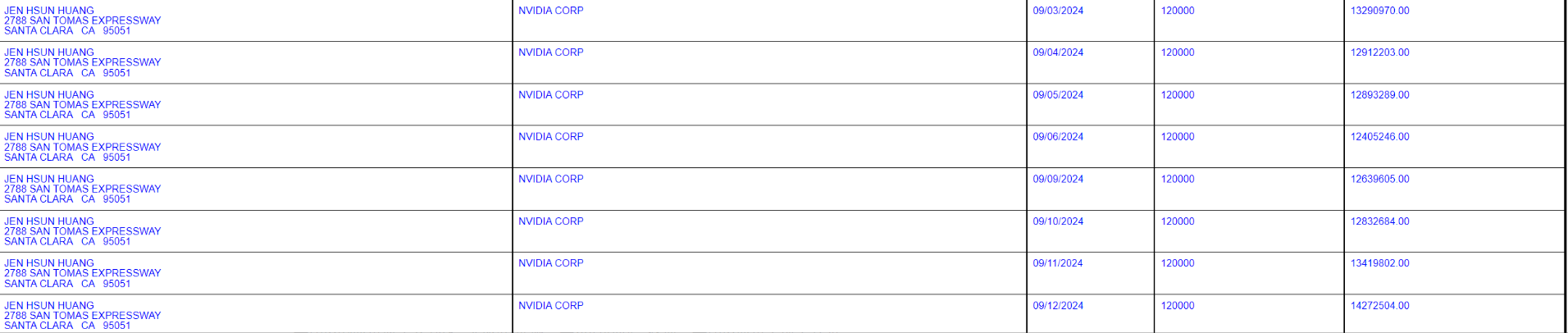 根据最新的监管文件,在6月13日至9月12日期间,黄仁勋在50个交易日内进行了减持操作,每次减持12万股。
