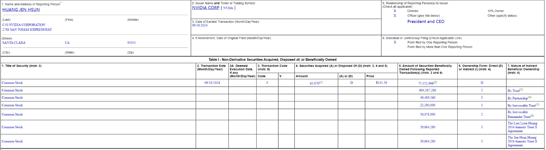 根据另一份文件,在完成减持后,黄仁勋现在直接持有7540万股英伟达股票,另外通过不同的信托和合伙企业持有7.86亿股英伟达股票。在该公司最新的委托书中,黄仁勋被列为该公司最大的个人股东。