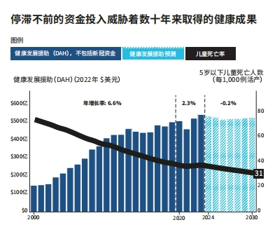 报告同时指出,在全球挑战加剧的同时,提供给非洲的对外援助总额占比却从2010年的40%降至目前的25%,为20年来的最低水平。目前超过一半的儿童死亡仍发生在撒哈拉以南非洲。对非洲援助的持续下降趋势将使数亿儿童面临死亡或罹患可预防疾病的严重风险,并威胁到全球健康事业在2000年到2020年间在非洲取得的空前进展。
