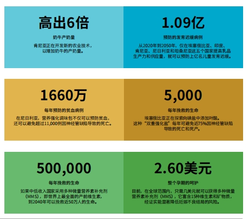 报告认为,营养不良需要大规模的解决方案,推广已经证实有效的解决方案能立刻带来改变。其中,新的农业技术可使牛奶产量增加两到三倍,到2050年可以防止上亿儿童发育迟缓;为孕妇提供优质产前维生素,则到2040年将挽救近50万的生命,改善2500万新生儿的出生状况。